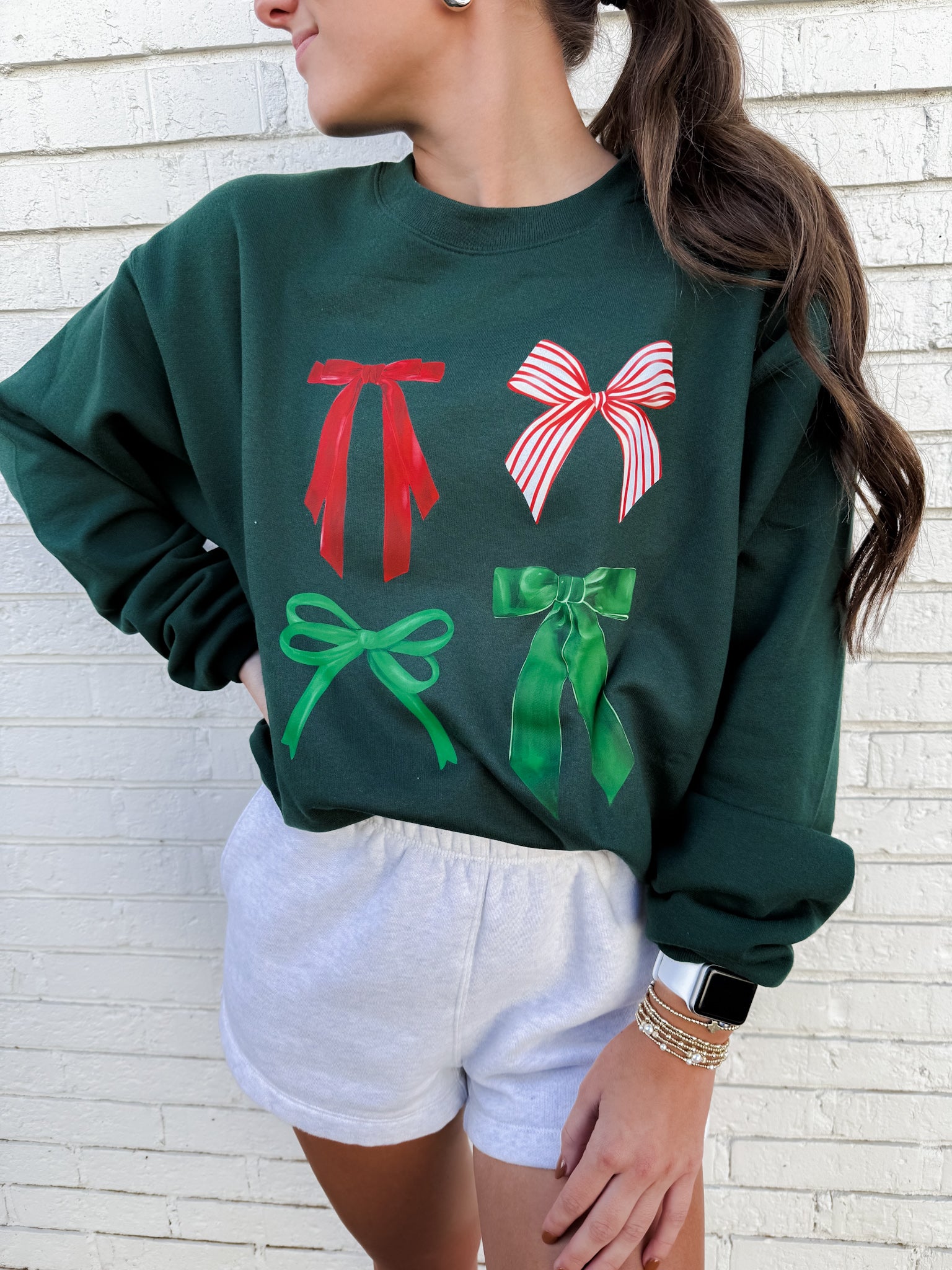 Forrest Green Hanes brand fleece lined sweatshirt printed with adorable Christmas themed bows.