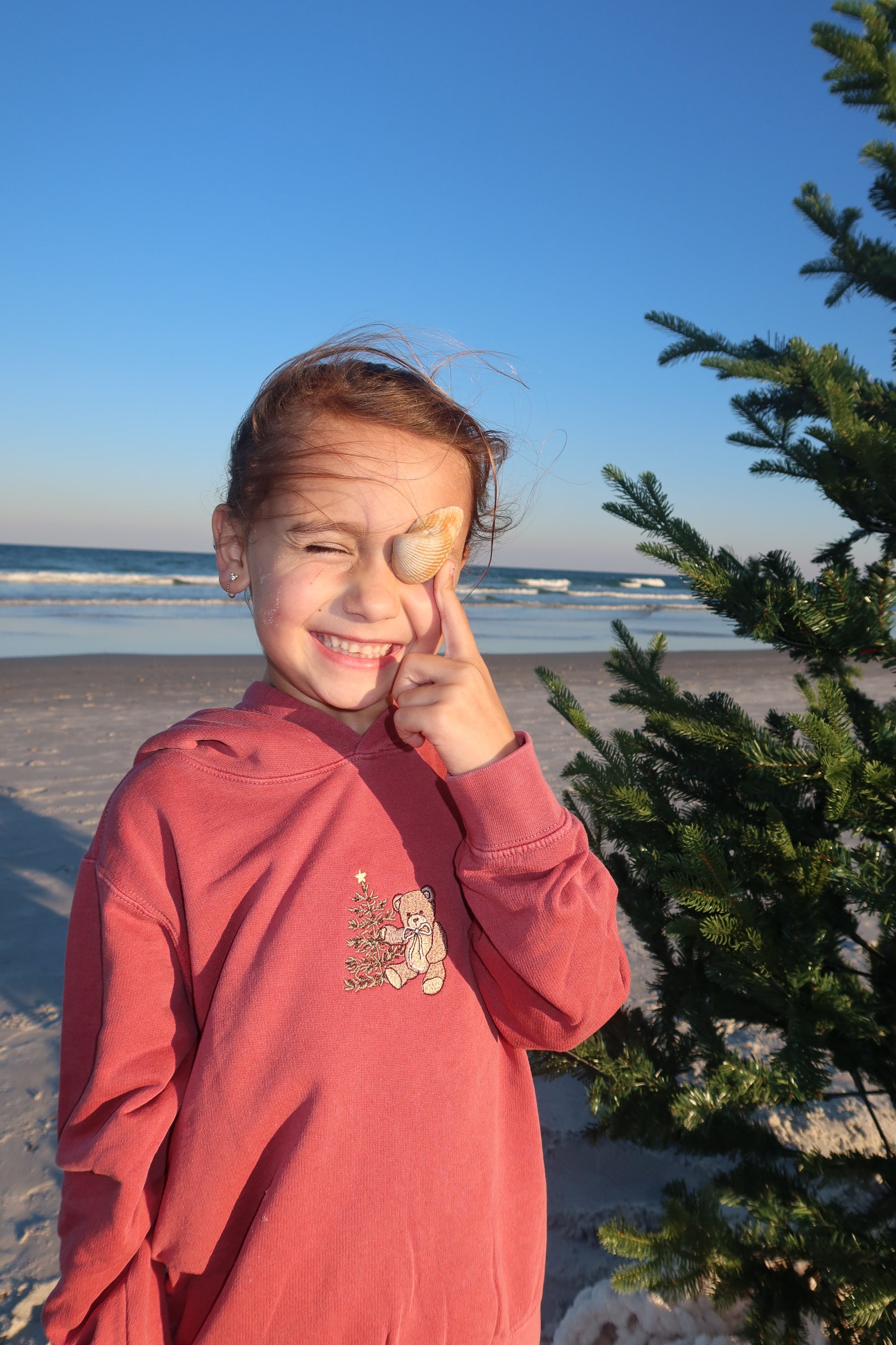 Comfort Colors brand brick colored hoodie embroidered with a Christmas tree & teddy bear.