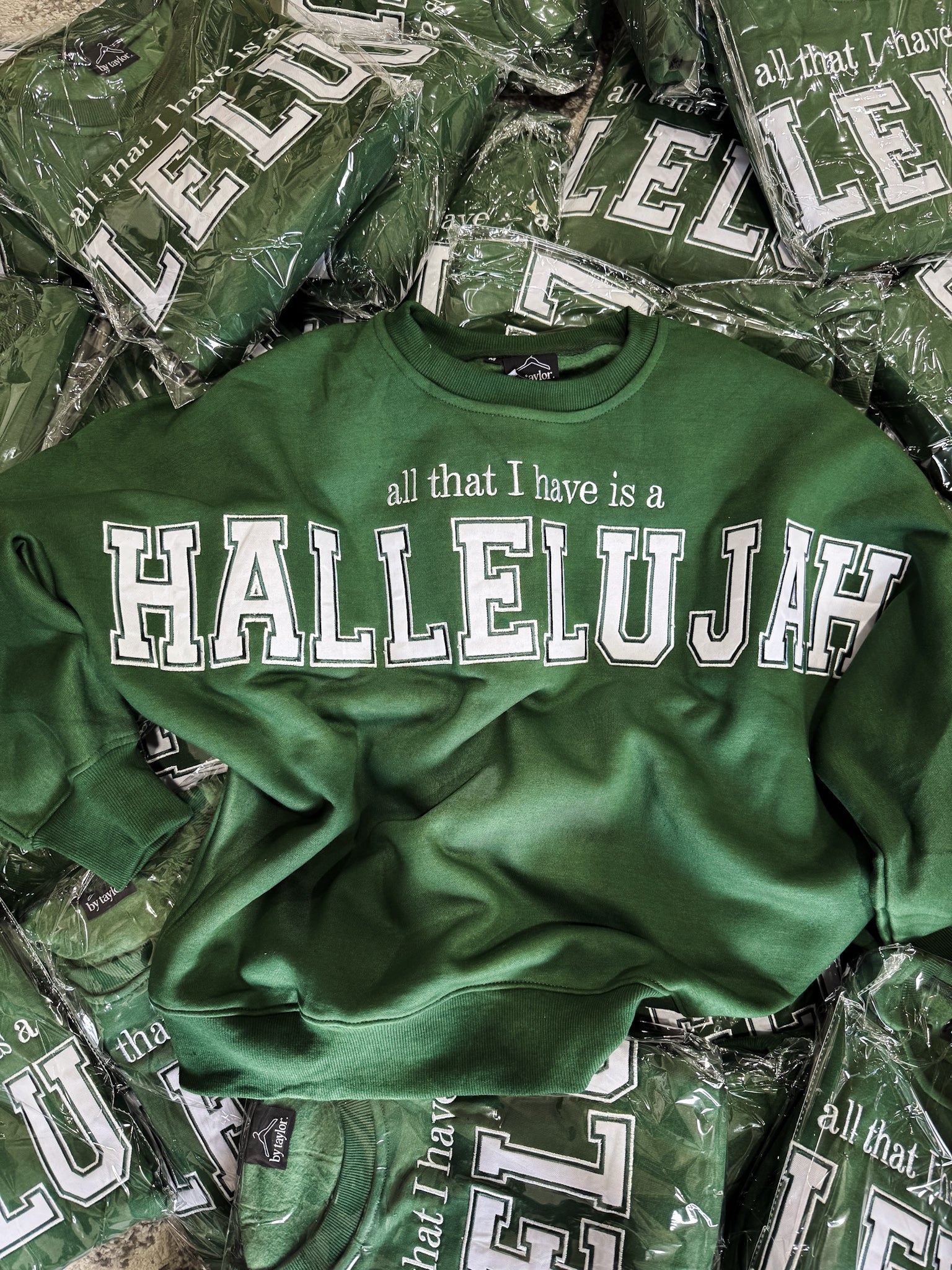 Dark green sweatshirt reading all that I have is a HALLELUJAH in a stitched oversized appliqué.