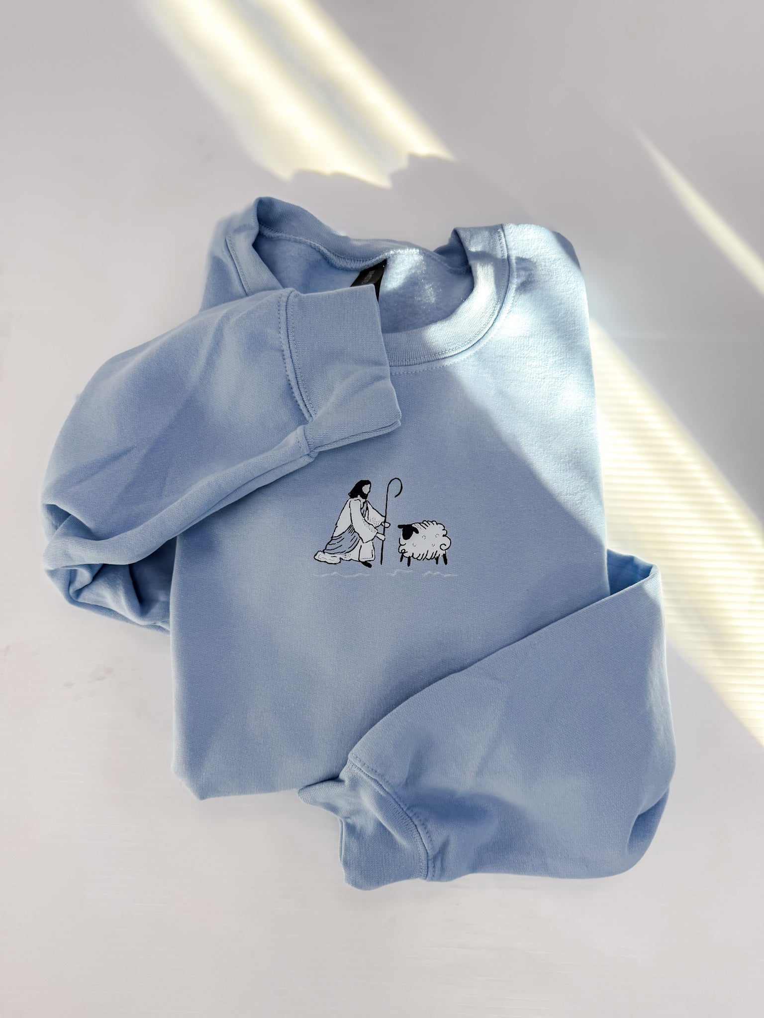 Baby blue fleece-lined sweatshirt printed with our popular “He left the 99 to rescue me” doodle!