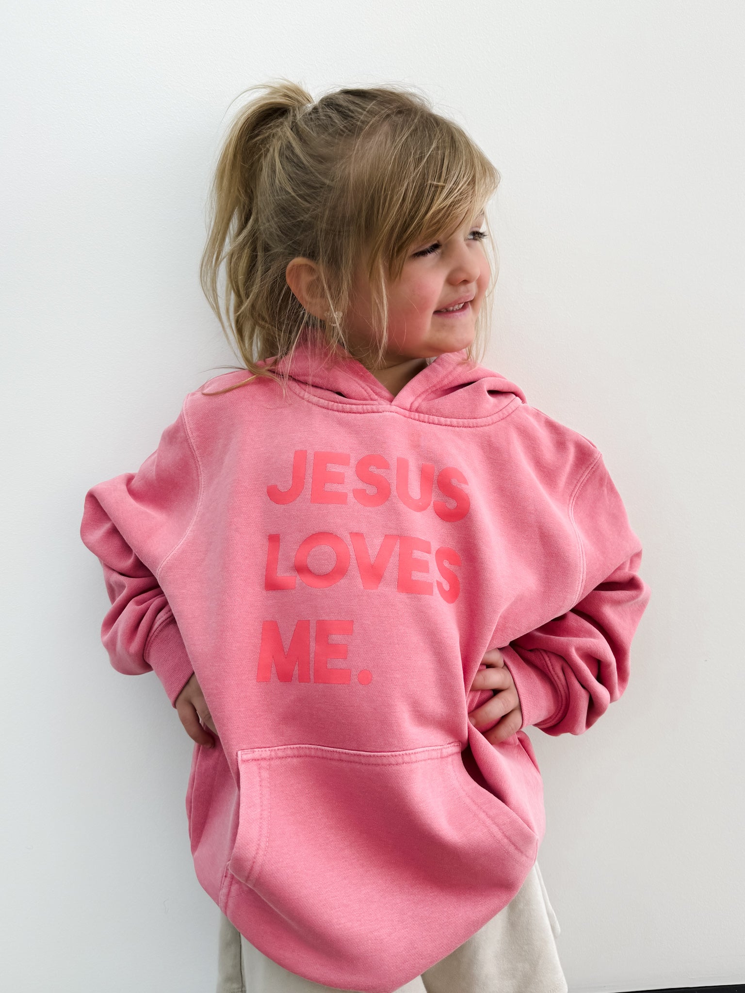 Independent brand pigment dyed youth hoodies reading, “JESUS LOVES ME”